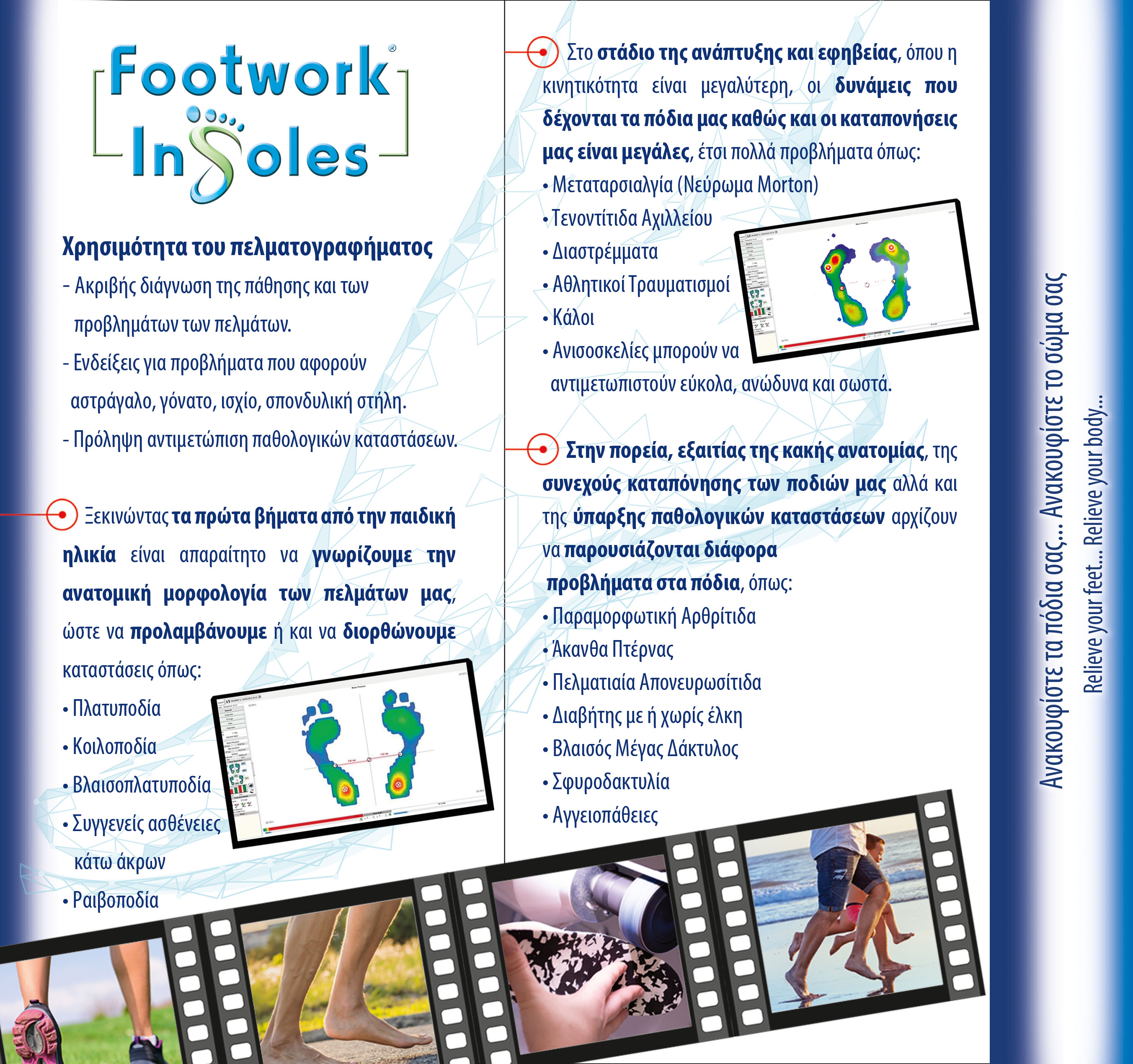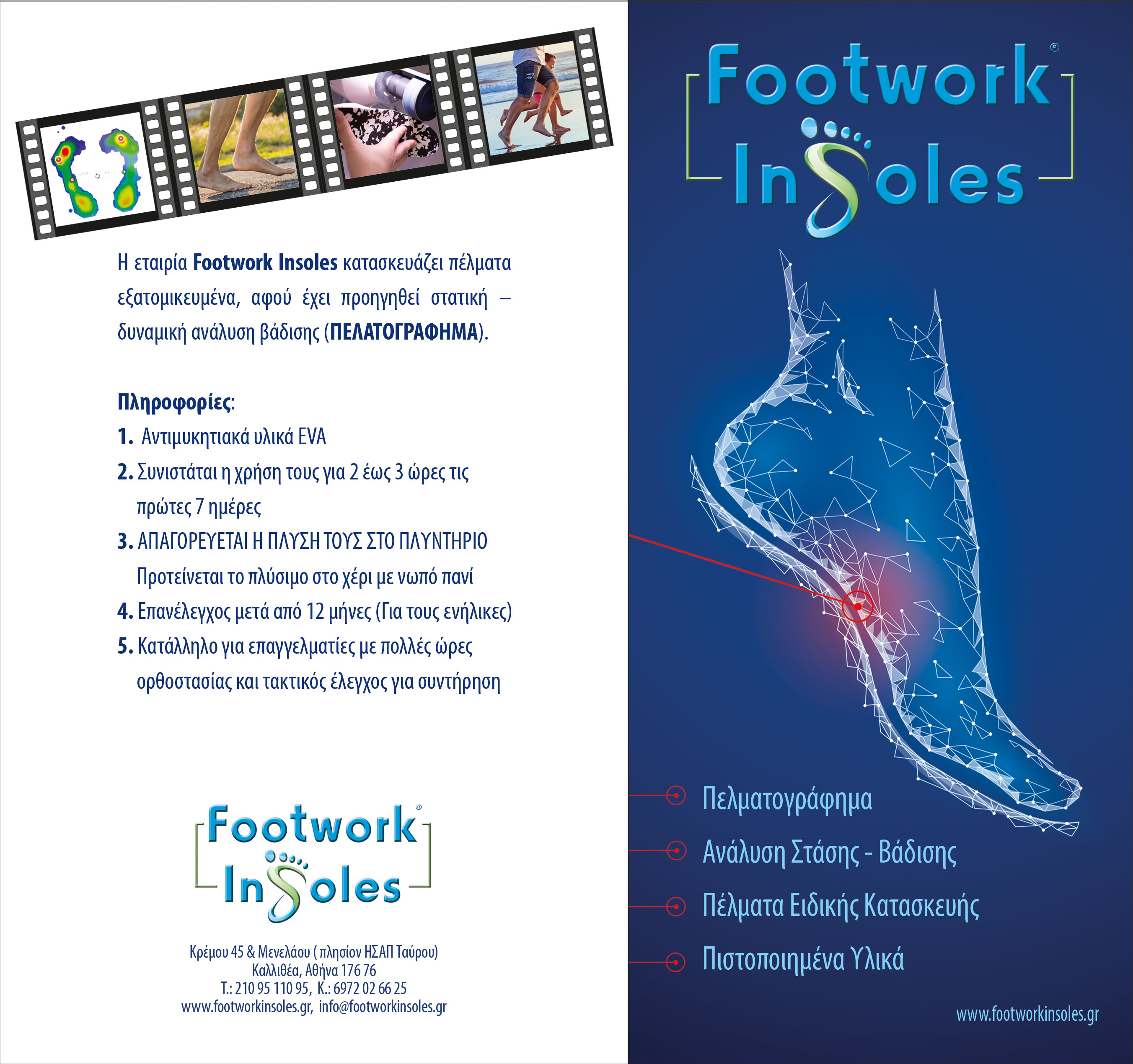 H FootWork Insoles διαθέτει 25 χρόνια εμπειρίας στον χώρο εμπορίας πελματογράφων και κατασκευής ορθοπεδικών εξατομικευμένων πελμάτων βάση πελματογραφήματος.Η εταιρία μας απευθύνεται σε επαγγελματίες που δραστηριοποιούνται στον χώρο της υγείας.Έχει σαν πρώτη προτεραιότητα να προσφέρει προϊόντα και υπηρεσίες σε συνεργάτες σε όλη την Ελλάδα και στο εξωτερικό καθώς επίσης και άμεση εξυπηρέτηση μετά την πώληση (After Sale Service)